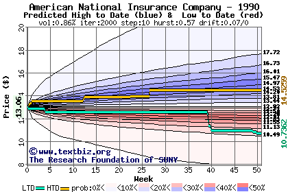 The high to date and low to date prices of the stock plotted against a random walk model for 1990 (what's this?).