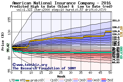The high to date and low to date prices of the stock plotted against a random walk model for 2016 (what's this?).