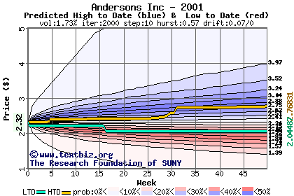 The high to date and low to date prices of the stock plotted against a random walk model for 2001 (what's this?).