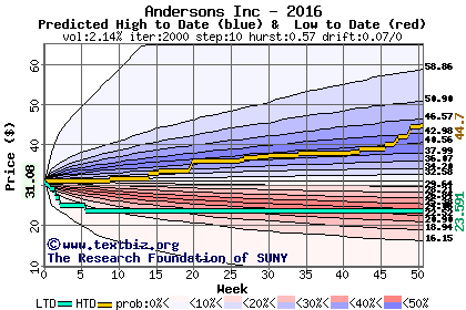 The high to date and low to date prices of the stock plotted against a random walk model for 2016 (what's this?).
