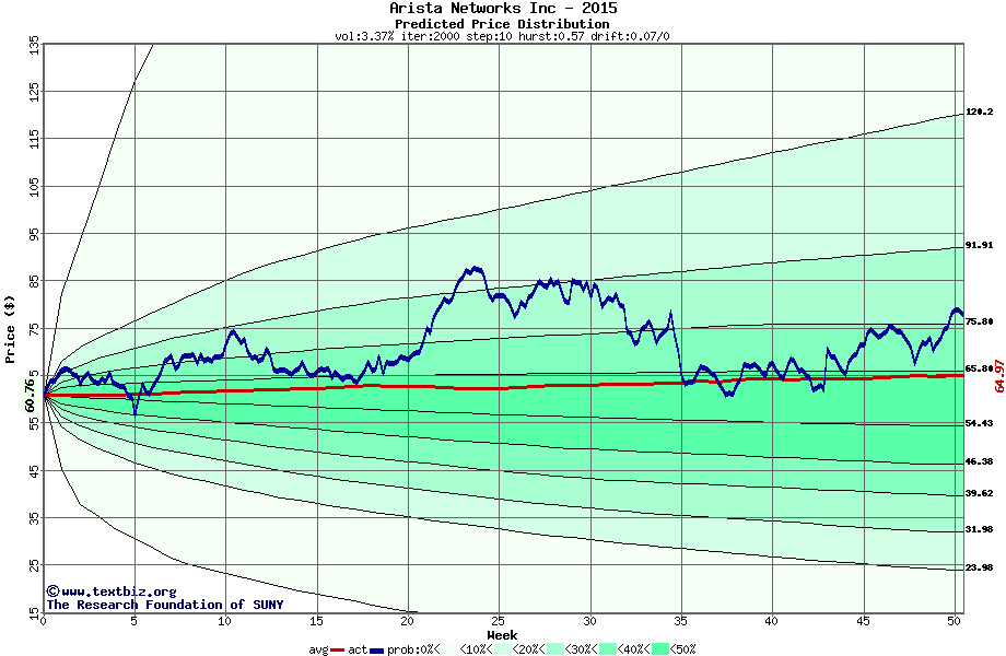 The following graph plots the year-to-date performance of the stock for 2015 compared to the probability calculated by a random walk model.