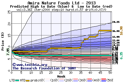 The high to date and low to date prices of the stock plotted against a random walk model for 2013 (what's this?).