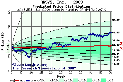 The following graph plots the year-to-date performance of the stock for 2009 compared to the probability calculated by a random walk model.