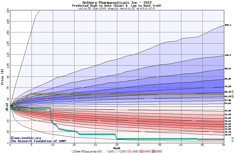 The following graph plots the year-to-date performance of the stock for 2012 compared to the probability calculated by a random walk model.