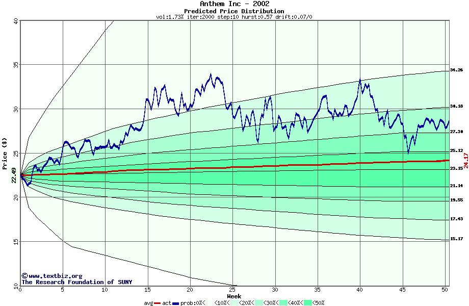 The following graph plots the year-to-date performance of the stock for 2002 compared to the probability calculated by a random walk model.