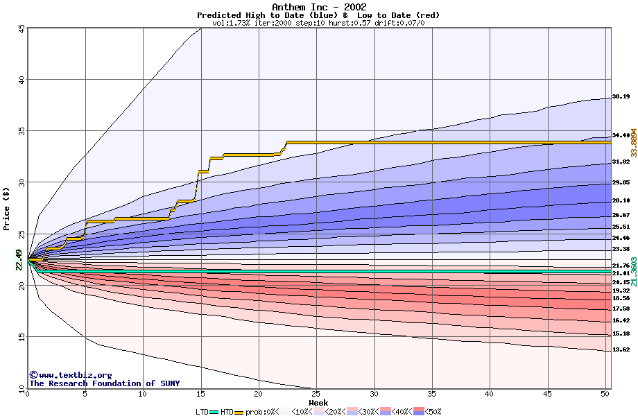 The high to date and low to date prices of the stock plotted against a random walk model for 2002 (what's this?).