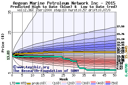The high to date and low to date prices of the stock plotted against a random walk model for 2015 (what's this?).