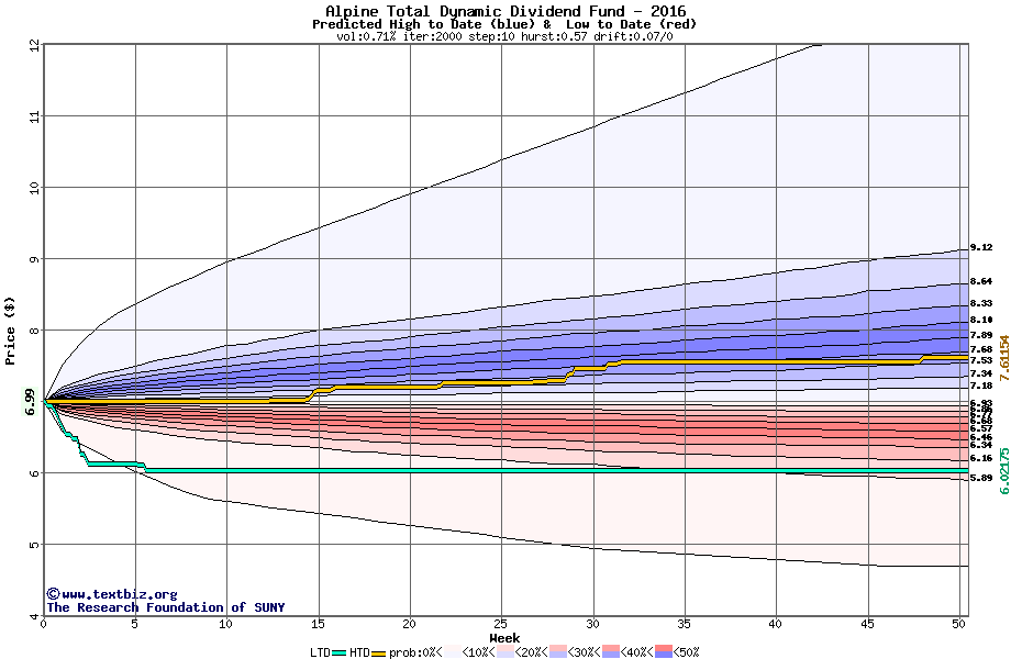The high to date and low to date prices of the stock plotted against a random walk model for 2016 (what's this?).