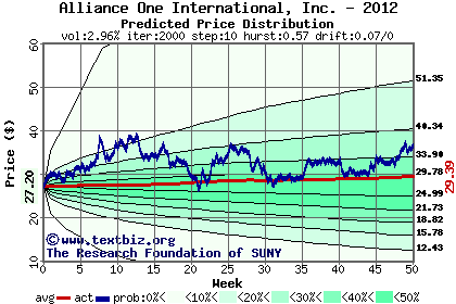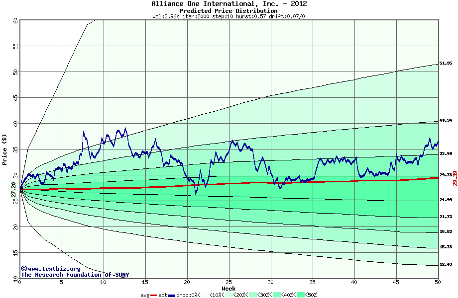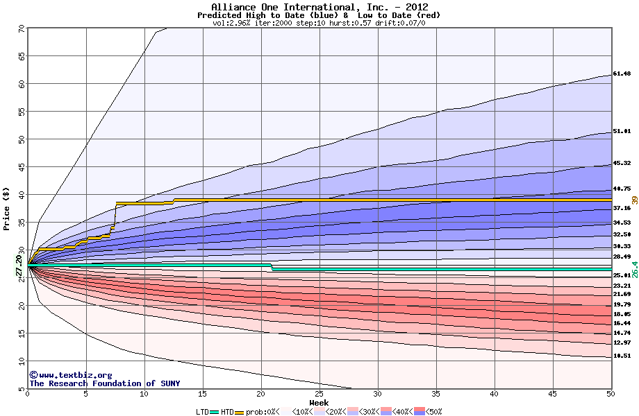 The following graph plots the year-to-date performance of the stock for 2012 compared to the probability calculated by a random walk model.