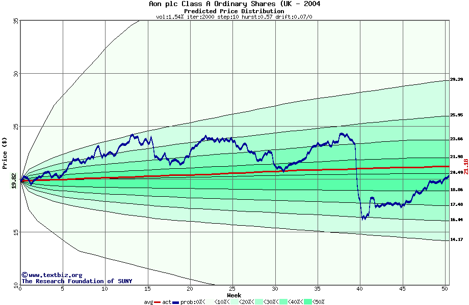 The following graph plots the year-to-date performance of the stock for 2004 compared to the probability calculated by a random walk model.