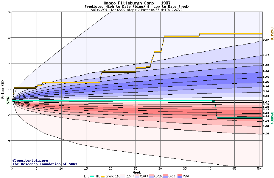 The high to date and low to date prices of the stock plotted against a random walk model for 1987 (what's this?).