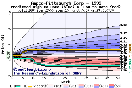 The high to date and low to date prices of the stock plotted against a random walk model for 1993 (what's this?).
