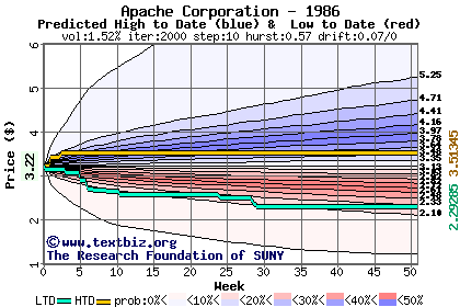 The high to date and low to date prices of the stock plotted against a random walk model for 1986 (what's this?).