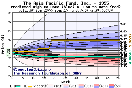 The high to date and low to date prices of the stock plotted against a random walk model for 1995 (what's this?).