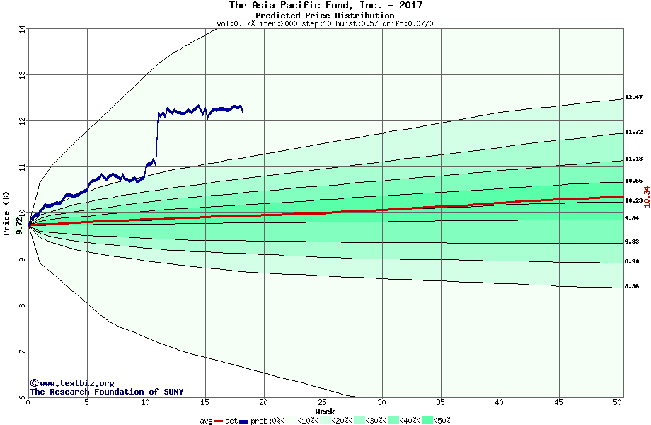 The following graph plots the year-to-date performance of the stock for 2017 compared to the probability calculated by a random walk model.