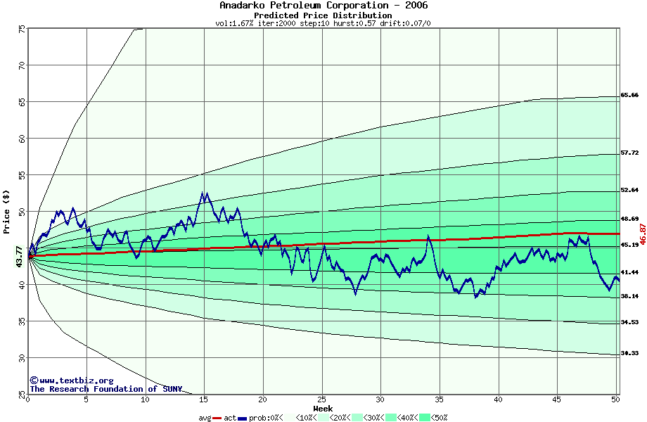 The following graph plots the year-to-date performance of the stock for 2006 compared to the probability calculated by a random walk model.