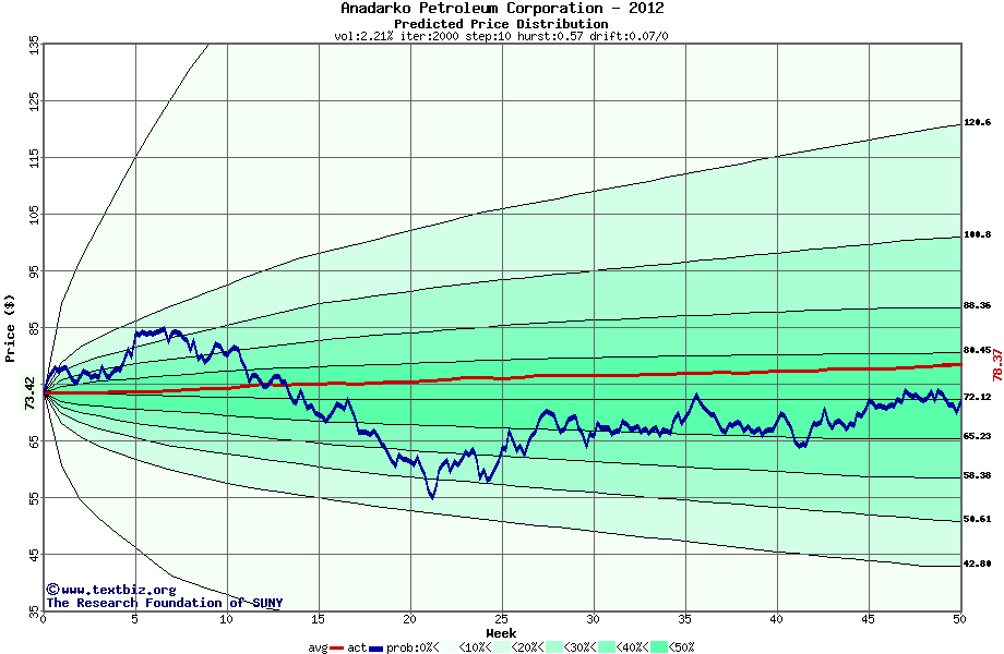 The following graph plots the year-to-date performance of the stock for 2012 compared to the probability calculated by a random walk model.