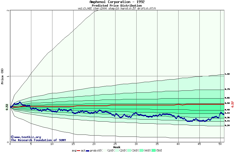 The following graph plots the year-to-date performance of the stock for 1992 compared to the probability calculated by a random walk model.