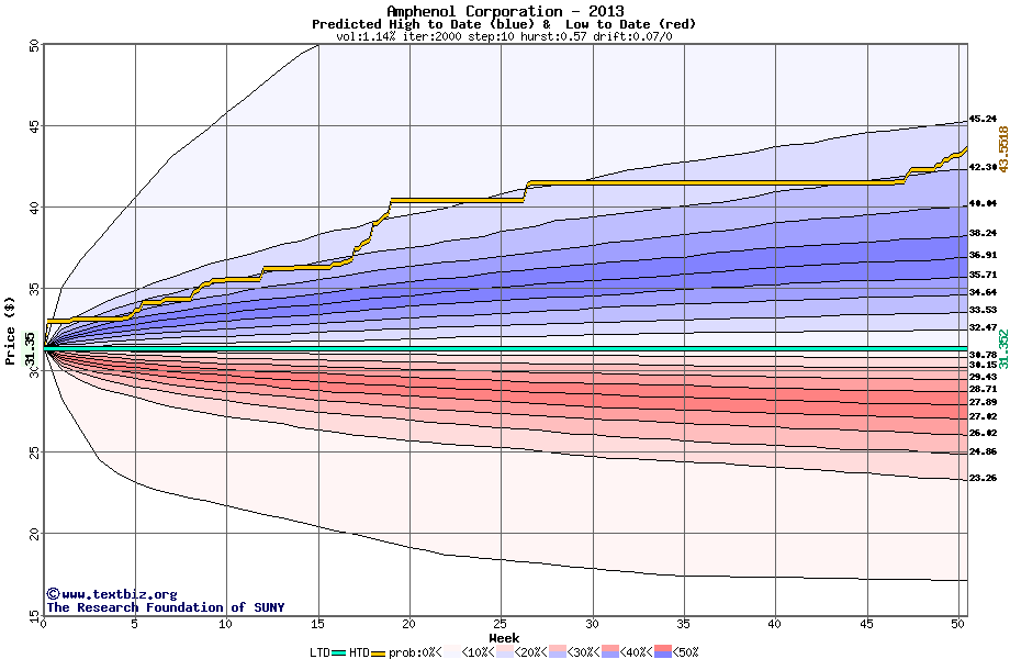 The following graph plots the year-to-date performance of the stock for 2013 compared to the probability calculated by a random walk model.