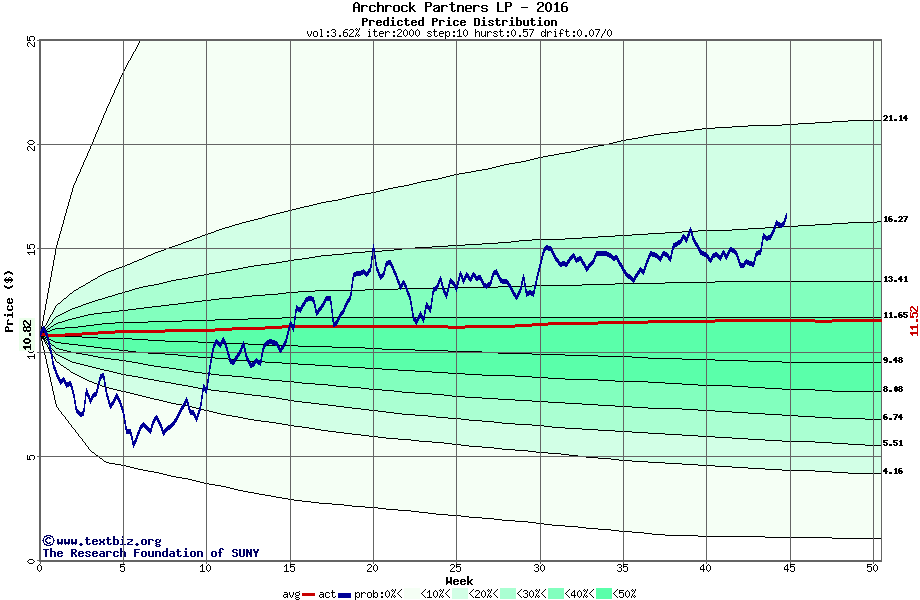 The following graph plots the year-to-date performance of the stock for 2016 compared to the probability calculated by a random walk model.