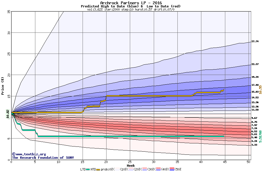 The high to date and low to date prices of the stock plotted against a random walk model for 2016 (what's this?).