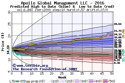 The high to date and low to date prices of the stock plotted against a random walk model for 2016 (what's this?).