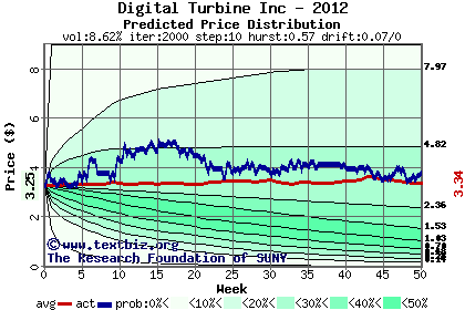 The high to date and low to date prices of the stock plotted against a random walk model for 2012 (what's this?).