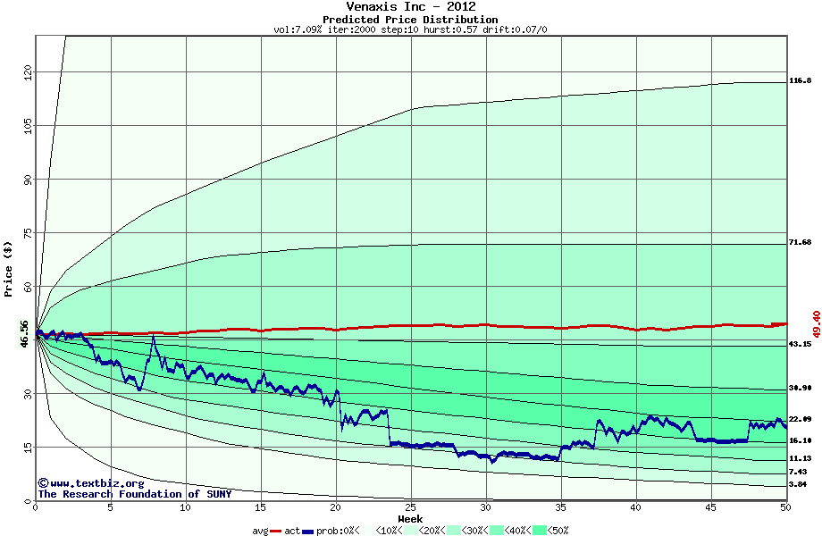 The following graph plots the year-to-date performance of the stock for 2012 compared to the probability calculated by a random walk model.