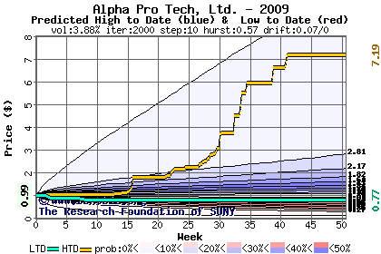 The high to date and low to date prices of the stock plotted against a random walk model for 2009 (what's this?).