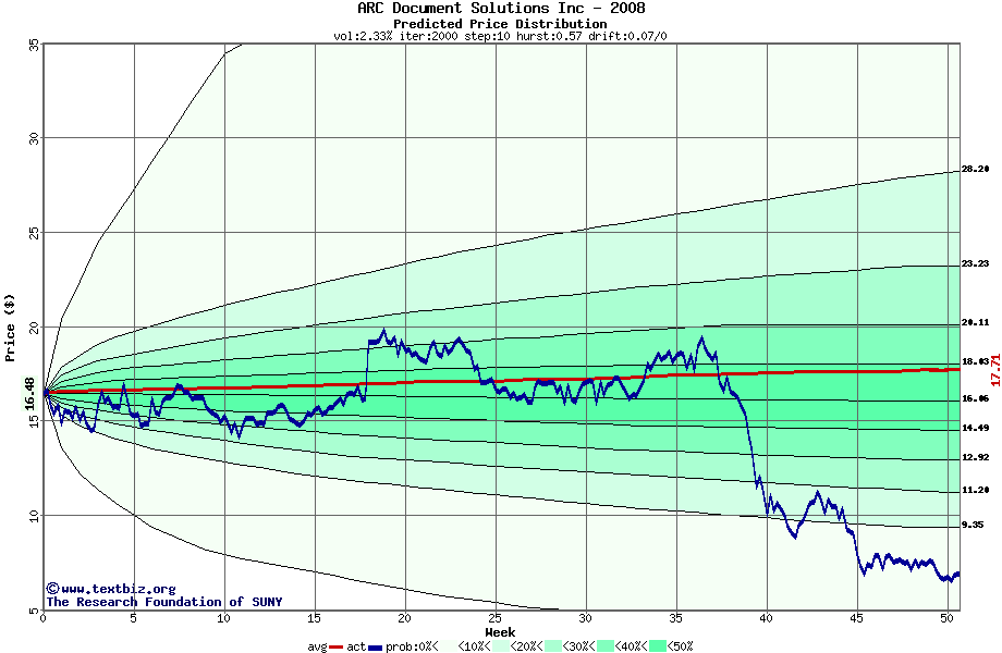The following graph plots the year-to-date performance of the stock for 2008 compared to the probability calculated by a random walk model.