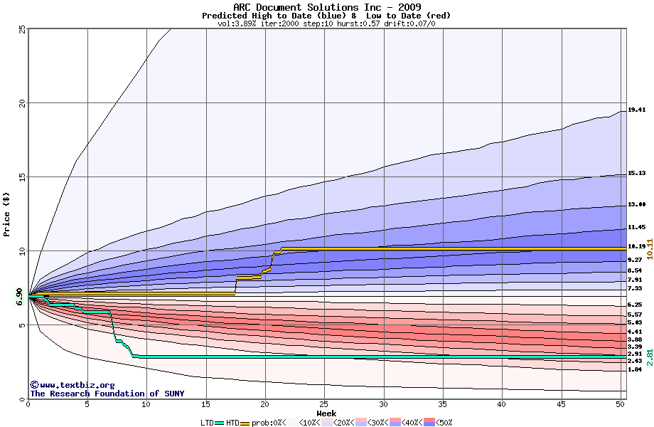 The high to date and low to date prices of the stock plotted against a random walk model for 2009 (what's this?).