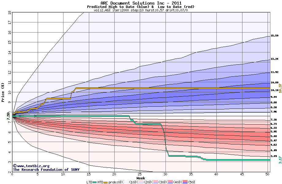 The high to date and low to date prices of the stock plotted against a random walk model for 2011 (what's this?).