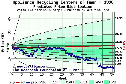 The high to date and low to date prices of the stock plotted against a random walk model for 1996 (what's this?).