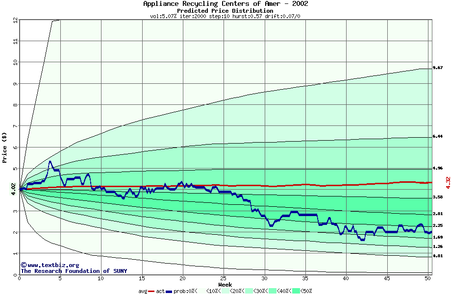 The following graph plots the year-to-date performance of the stock for 2002 compared to the probability calculated by a random walk model.