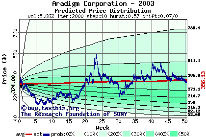 The high to date and low to date prices of the stock plotted against a random walk model for 2003 (what's this?).