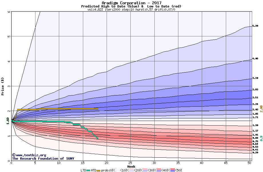 The high to date and low to date prices of the stock plotted against a random walk model for 2017 (what's this?).