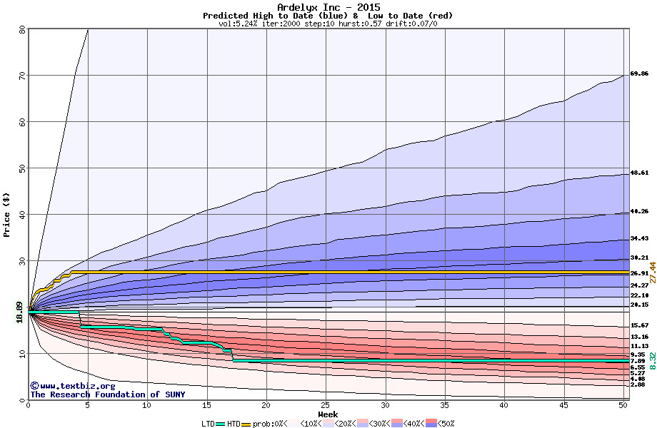 The high to date and low to date prices of the stock plotted against a random walk model for 2015 (what's this?).