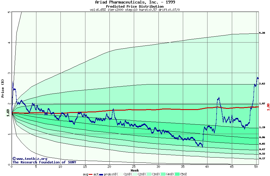 The following graph plots the year-to-date performance of the stock for 1999 compared to the probability calculated by a random walk model.