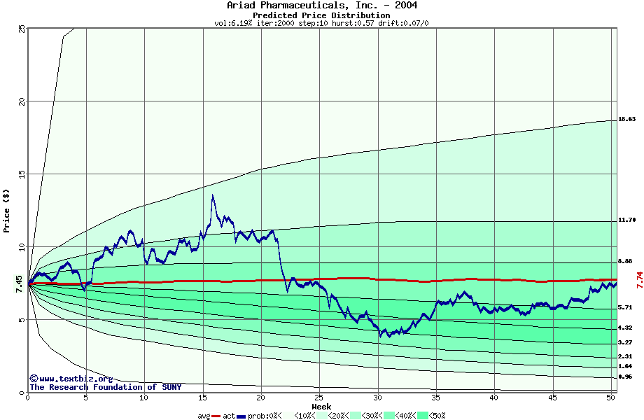 The following graph plots the year-to-date performance of the stock for 2004 compared to the probability calculated by a random walk model.
