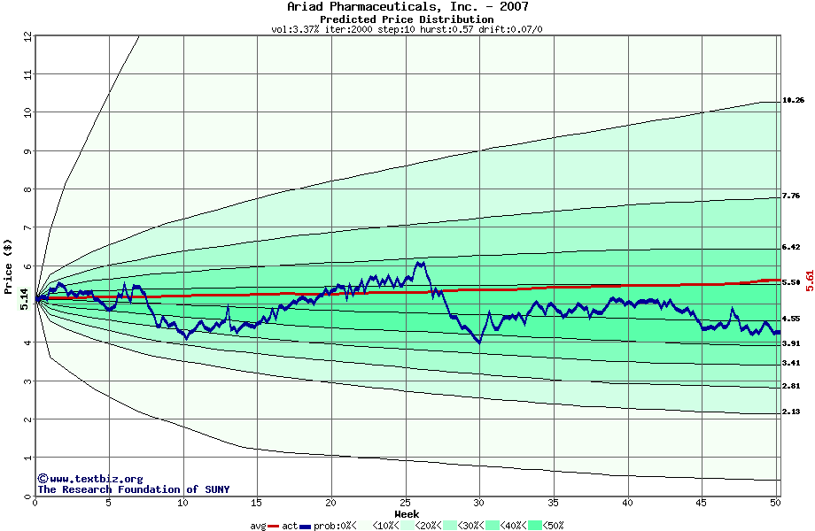 The following graph plots the year-to-date performance of the stock for 2007 compared to the probability calculated by a random walk model.