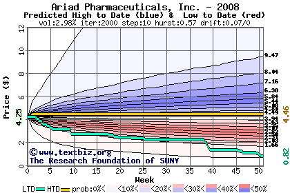 The high to date and low to date prices of the stock plotted against a random walk model for 2008 (what's this?).