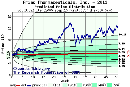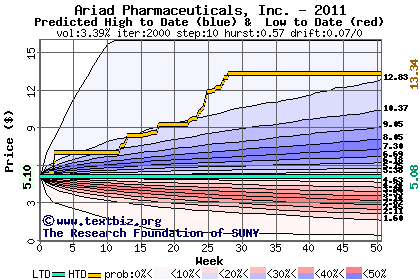 The high to date and low to date prices of the stock plotted against a random walk model for 2011 (what's this?).