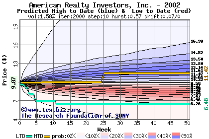 The high to date and low to date prices of the stock plotted against a random walk model for 2002 (what's this?).