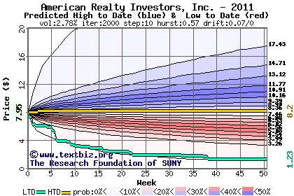 The high to date and low to date prices of the stock plotted against a random walk model for 2011 (what's this?).