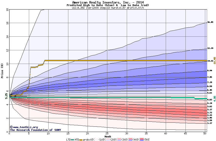 The following graph plots the year-to-date performance of the stock for 2014 compared to the probability calculated by a random walk model.