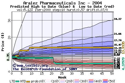 The high to date and low to date prices of the stock plotted against a random walk model for 2004 (what's this?).