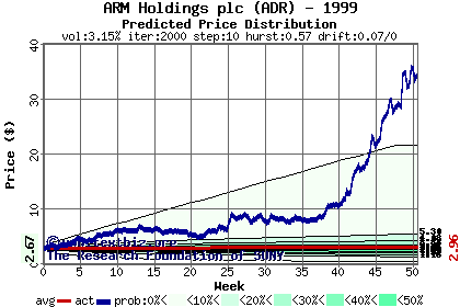 The high to date and low to date prices of the stock plotted against a random walk model for 1999 (what's this?).
