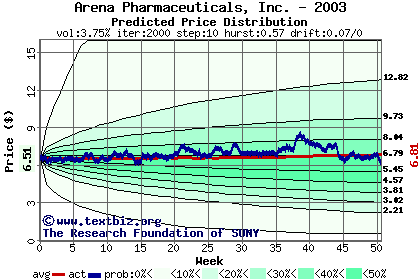 The following graph plots the year-to-date performance of the stock for 2003 compared to the probability calculated by a random walk model.