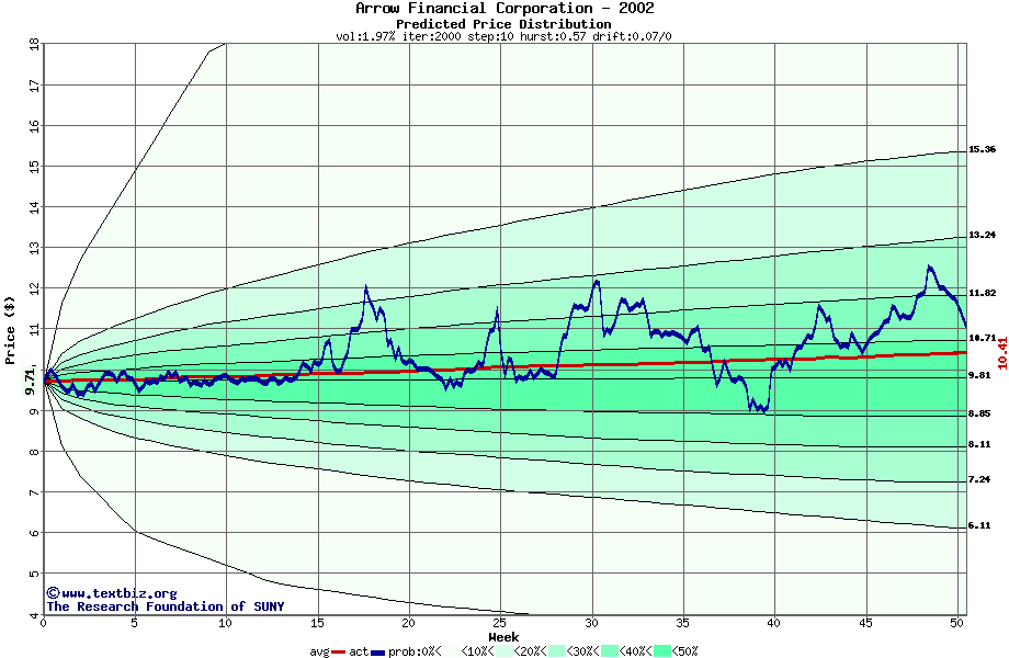 The high to date and low to date prices of the stock plotted against a random walk model for 2002 (what's this?).
