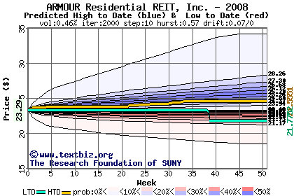 The high to date and low to date prices of the stock plotted against a random walk model for 2008 (what's this?).